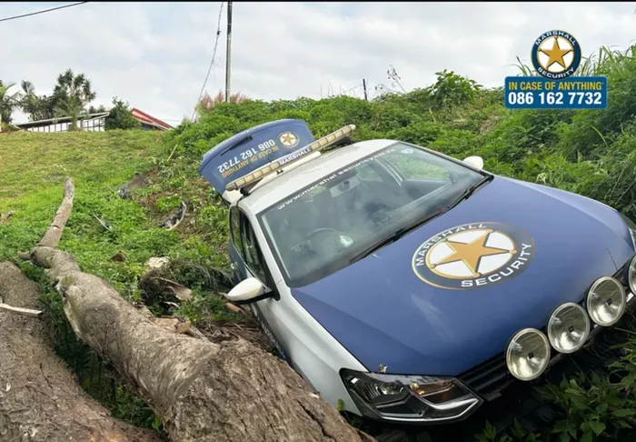 A security company’s vehicle crashed down a bank. An armed response officer lost control of his vehicle and crashed down a bank when he came under heavy gunfire during a house robbery on Firwood Road. Picture: Marshall Security