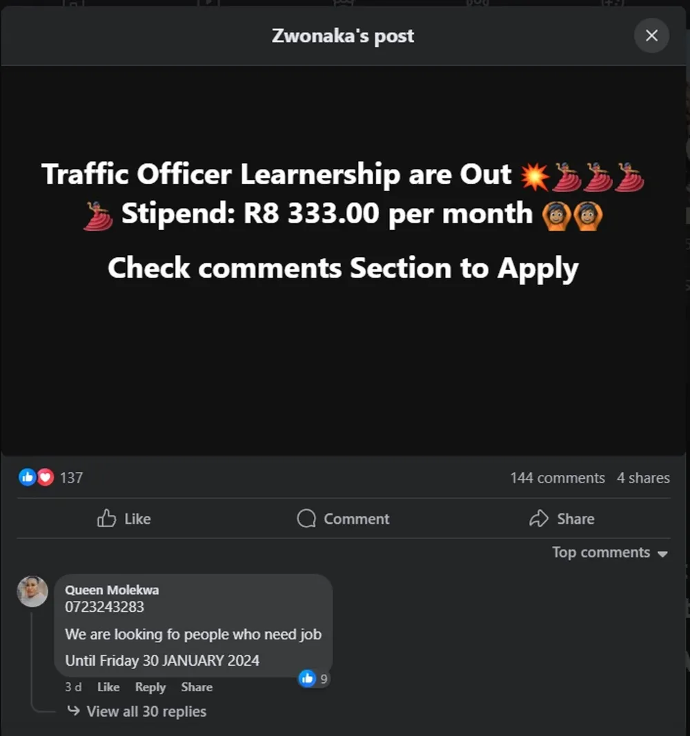 One of many traffic officer learnership posts on Facebook, posted on SA Youth Employment / Applications, said traffic officer learnerships are out with an R8 333 monthly stipend. The closing date is January 30, 2024.