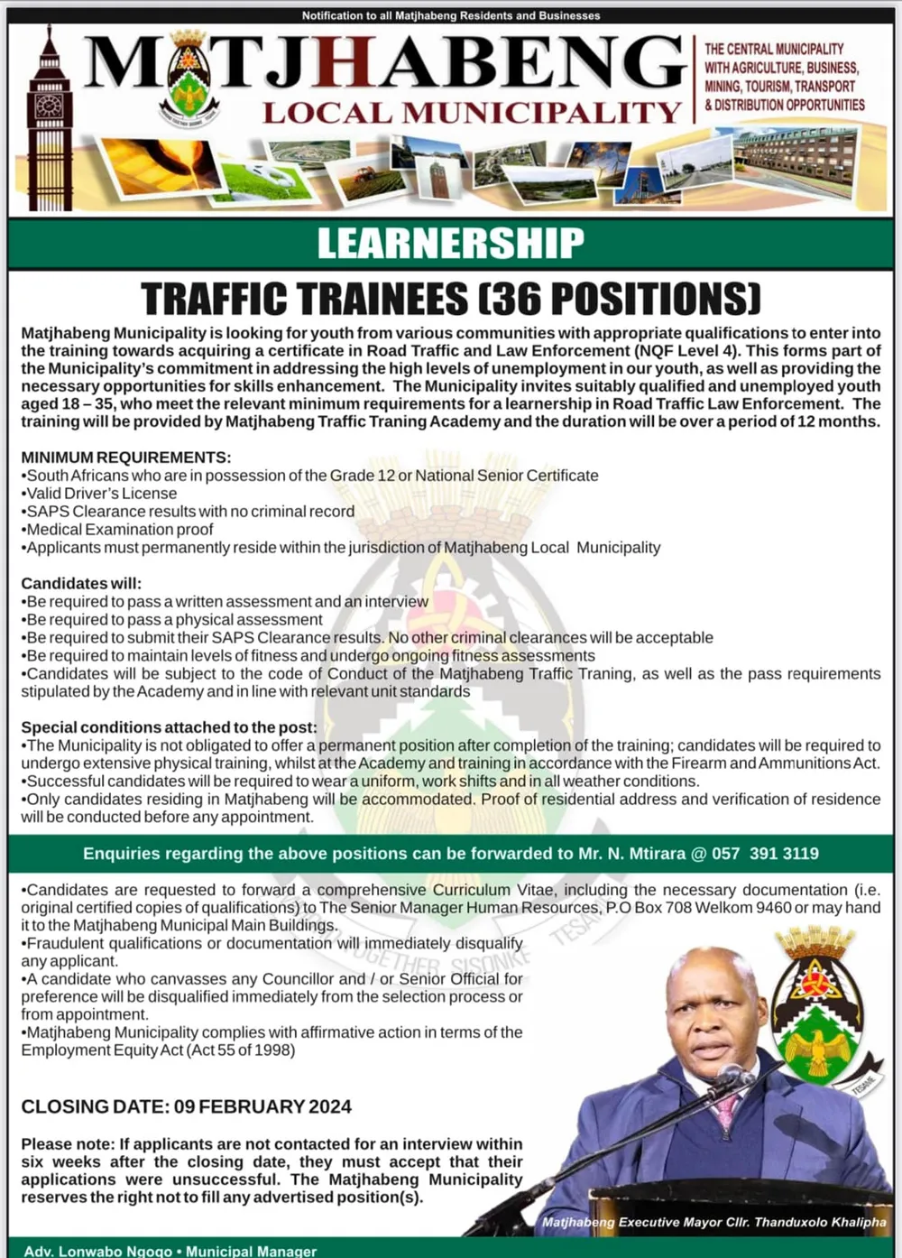 Meanwhile, the Matjhabeng Local Municipality in Welkom has 36 positions available for a traffic trainees learnership.