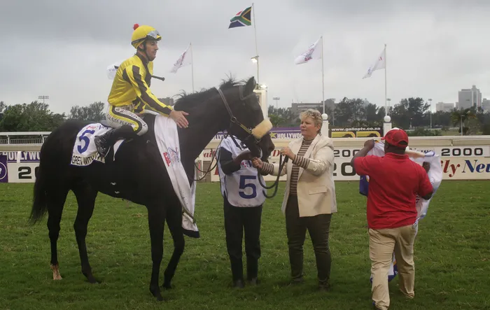Green With Envy, ridden by Craig Zackey, won the Daily News 2000 narrowly at the Greyville racecourse on Saturday. Holding the favourite’s reigns is Nicolette Rosco, one of the proud owners. | KHAYA NGWENYA Independent Newspapers
