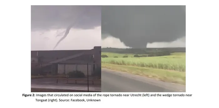 Images that circulated on social media of the rope tornado near Utrecht (left) and the wedge tornado near oThongathi (right). Source: Facebook, Unknown