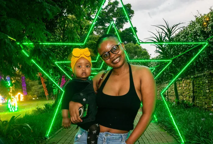 Sihle Ndamane and baby Ompha Mphephu take in the lit displays at the Durban Botanic Gardens Trail of Lights