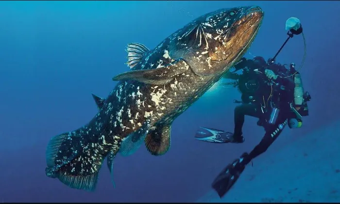 The fish that time forgot, which South Africa discovered: A diver gets a close up with a Coelacanth, an ancient 'living fossil' from 400 million years ago.