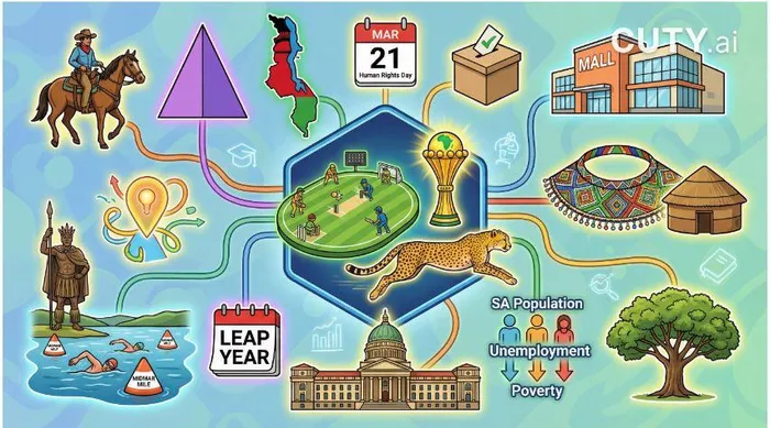 1 Six. 2 Eleven. 3 Senegal. 4 The cheetah. 5 A cowboy. 6 Three, and being an isosceles triangle, all the sides are equal length. 7 Lilongwe. 8 March 21, Human Rights Day. 9 Local Government Elections. 10 Galleria Shopping Mall. 11 The amaXhosa. 12 Marula tree. 13 64 million. 14 About 42%. 15 About 55%. 16 490 – 400 in the National Assembly and 90 in the National Council of Provinces. 17 From about R1.32 million to R3.m each year. 18 366. 19 KwaDukuza (the site of his assassination). 20 The Midmar Mile.