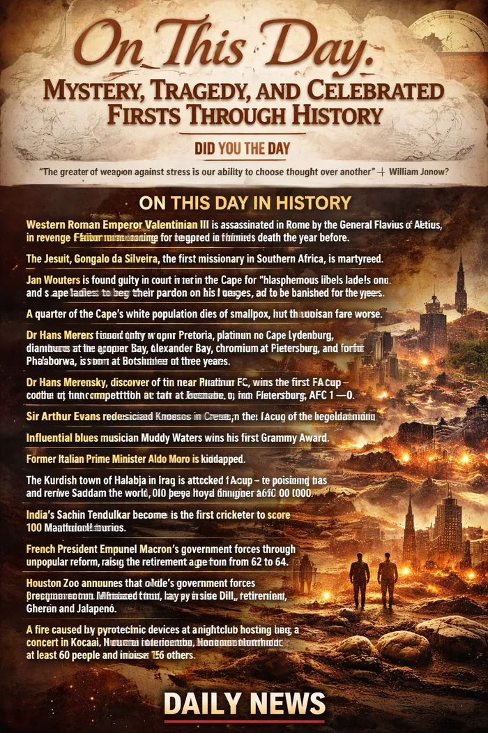 455 Western Roman Emperor Valentinian III is assassinated in Rome by the bodyguards of General Flavius Aetius, in revenge for ordering the general’s death the year before.