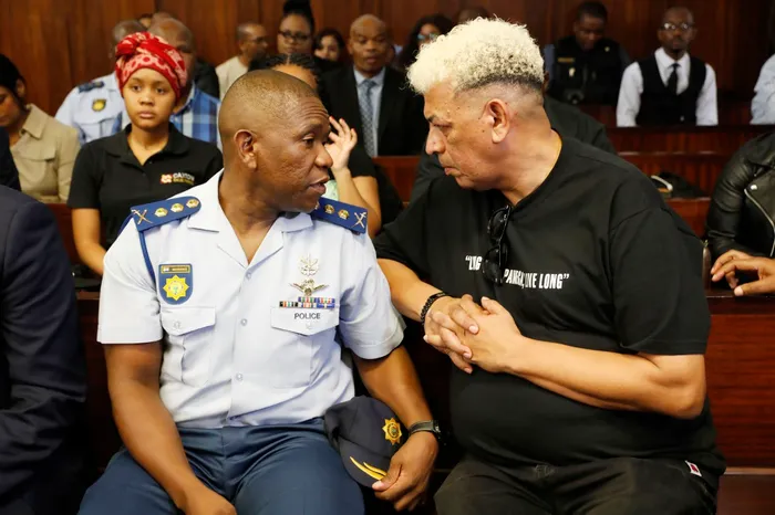 South Africa - Durban - 29 February 2024 - KwaZulu Natal prpvincial commisioner South Africa - Durban - 29 February 2024 - KwaZulu Natal prpvincial commisioner Nhlanhla Mkhwanazi and slain singer AKA's father Tony Forbes having a chat inside Durban Magistrate court Picture: Doctor Ngcobo