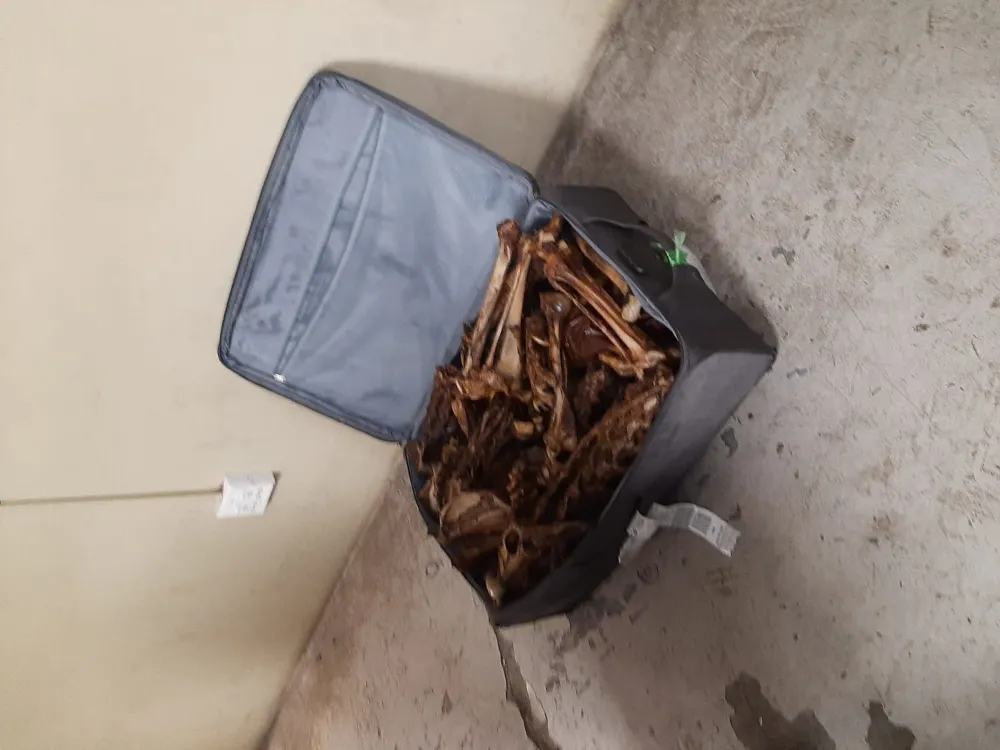 An open bag full of bones A man was arrested at OR Tambo International Airport with bones of at least five lions, heading to Vietnam via Qatar. Photo: Hawks