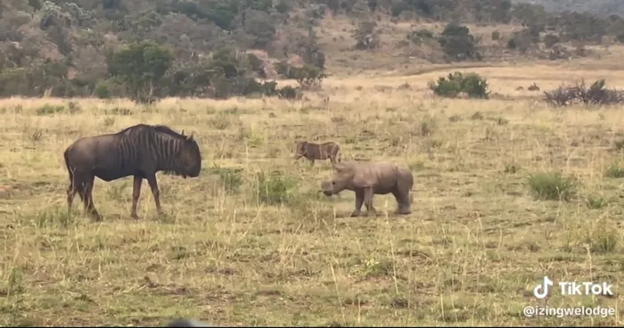 In a video which has gone viral on social media, a baby white rhino was caught playfully charging at a wildebeest which seems to understand that the calf wants to play and happily joins in the merriment.