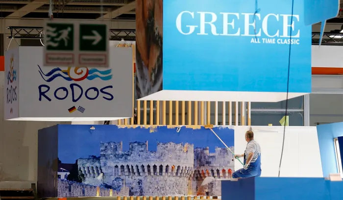 A worker paints the booth representing Greece at the International Tourism fair (ITB) in Berlin March 4, 2013. Around 11,000 exhibitors from more than 180 countries take part at the ITB that runs from March 6 to 10 in the German capital. REUTERS/Tobias Schwarz (GERMANY - Tags: SOCIETY TRAVEL)