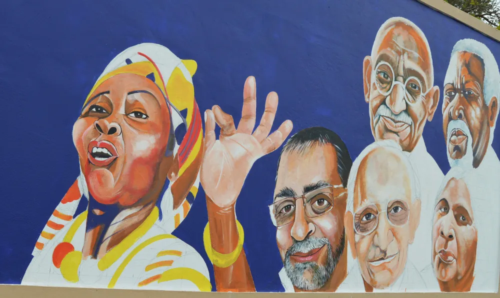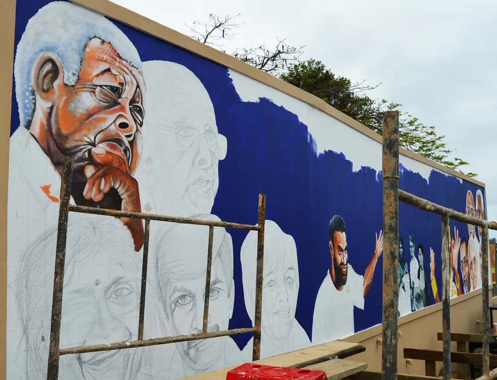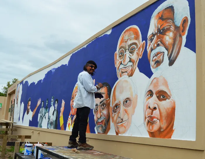 In Chatsworth he has the faces of Chief Albert Luthuli; Mohandas Gandhi, Nelson Mandela, Kathrada, Imtiaz Sooliman, Dr Gcina Mhlophe, Lenny Naidu, Kumi Naidoo, Judge Navi Pillay, Anshu Padayachee, Fatima Meer, Bhai Rambharos and a group of women who marched to the Union Buildings in 1956. He plans to paint other murals in Phoenix, Verulam and Merewent. These will include stalwarts from those areas.
