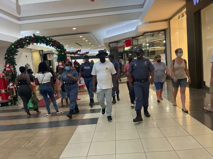 Police Minister Bheki Cele conducted a walkabout at the Broadwalk Mall. He was accompanied by provincial police commissioner, Lieutenant-General Nhlanhla Mkhwanazi (right). Picture: Supplied