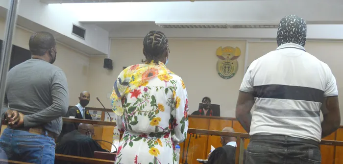 Widow Ziningi Nzama (centre) with her co-accused, from left, her “boyfriend” Mthokoziseni Majozi, 49, and a family friend Simphiwe Silangwe, 29, appear in the Camperdown Magistrate’s Court where they are accused of murder, fraud and conspiracy to commit murder of the widow’s son, Asanda Nzama. Picture: Tumi Pakkies/African News Agency (ANA)