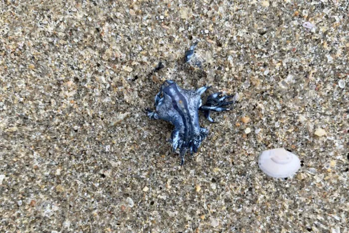 Saambr’s Ann Kunz said Camilla Jacobs and her son were enjoying a holiday on the South Coast last weekend until their swim was interrupted by the arrival of hundreds of small blue bottles.