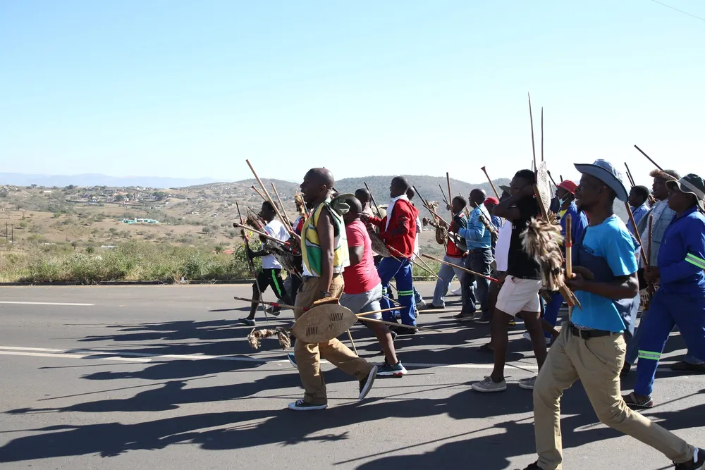 At the front, while proceeding to the home, was a Zulu regiment battalion carrying sticks, knobkerries and other traditional weapons.