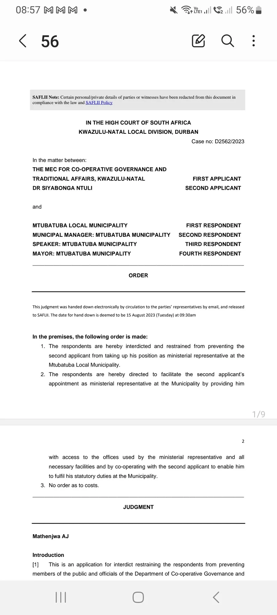 NEWS: Pietermaritzburg High Court has ruled in favour of KZN CoGTA & Dr Siya Ntuli in the matter against the IFP-run Mtubatuba municipality. The court has interdicted the municipality from barring Ntuli to start his work as an administrator & grant him to acesss his office. @IOL pic.twitter.com/D4fIqKpFKT