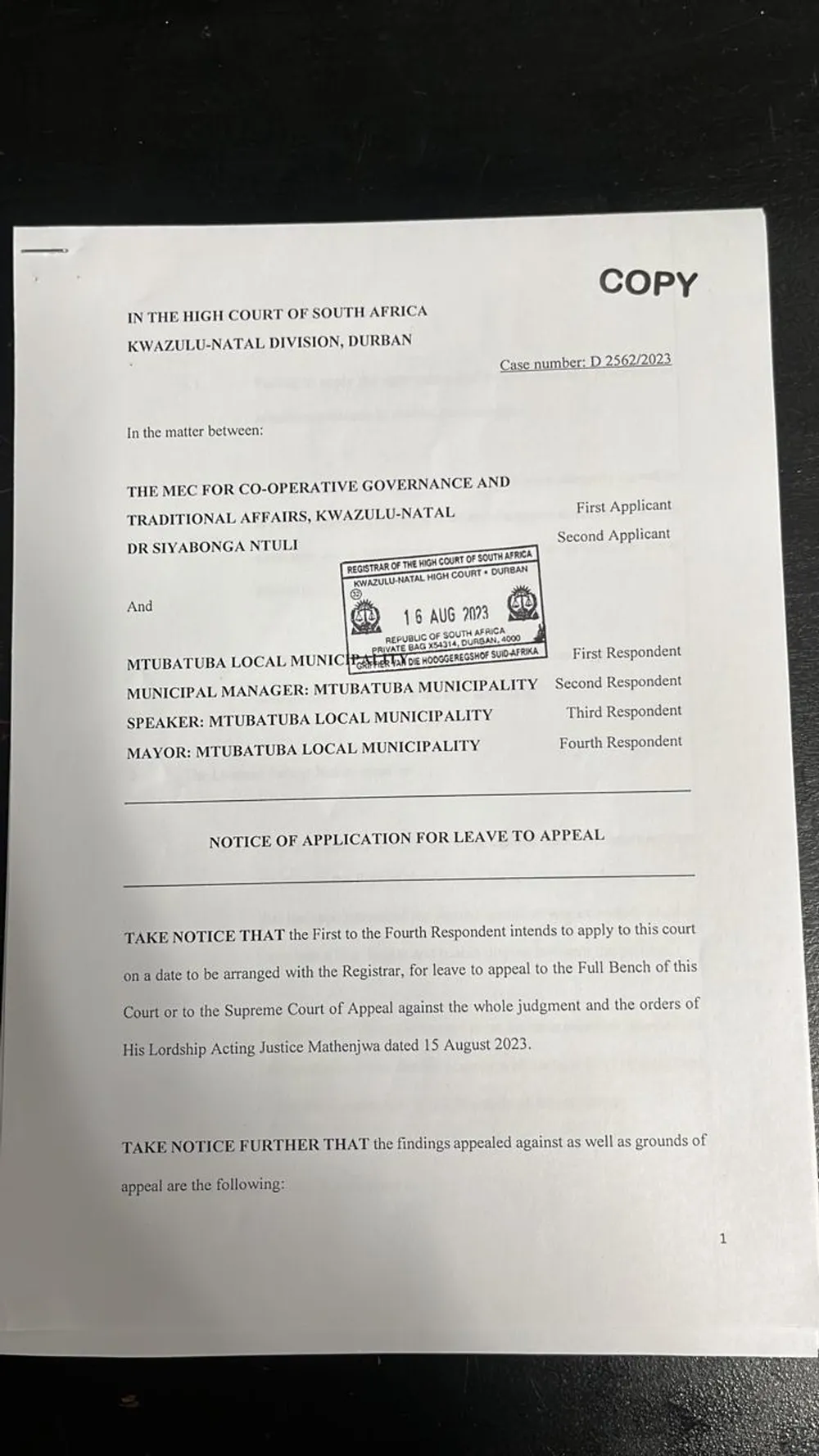However, his return sparked another legal battle as the Mayor of the municipality, Mxolisi Mthethwa, lodged an impromptu appeal to set aside the initial ruling that brought Ntuli back.