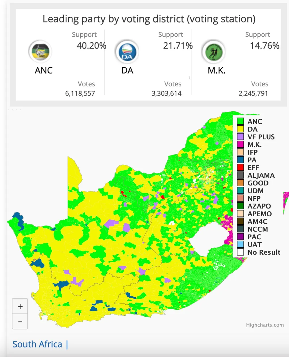 The ANC has only managed to grab around 40% of the vote and would be forced to go into a coalition with other parties to govern the country.