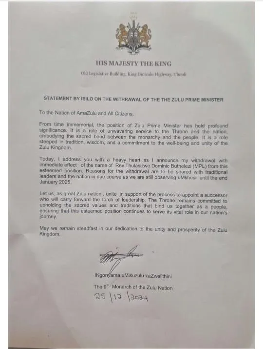 "I address you with a heavy heart as I announce my withdrawal with immediate effect of the name of Rev Thulasizwe Dominic Buthelezi from this esteemed position. Reasons for the withdrawal are to be shared with traditional leaders and the nation in due course as we are still observing uMkhosi until the end of January," the Zulu King said in the letter.