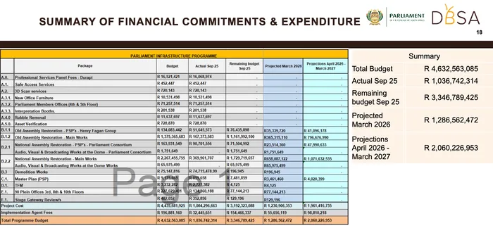 The Development Bank of Southern Africa (DBSA), which has been tasked with overseeing the restoration, provided members of the Joint Standing Committee on Financial Management of Parliament with a comprehensive overview of the status of the project, which includes the reconstruction of the National Assembly and Old Assembly buildings and the refurbishment of 90 Plein Street offices.