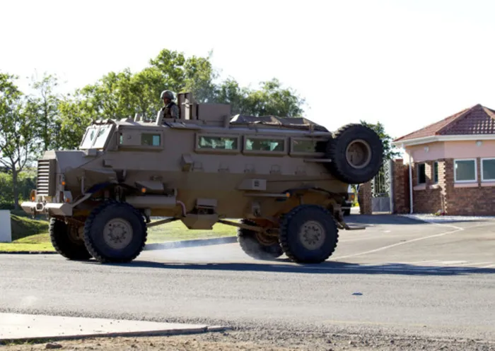 Police, armoured cars and an ambulance were parked on the grass in front of the Mandela house.