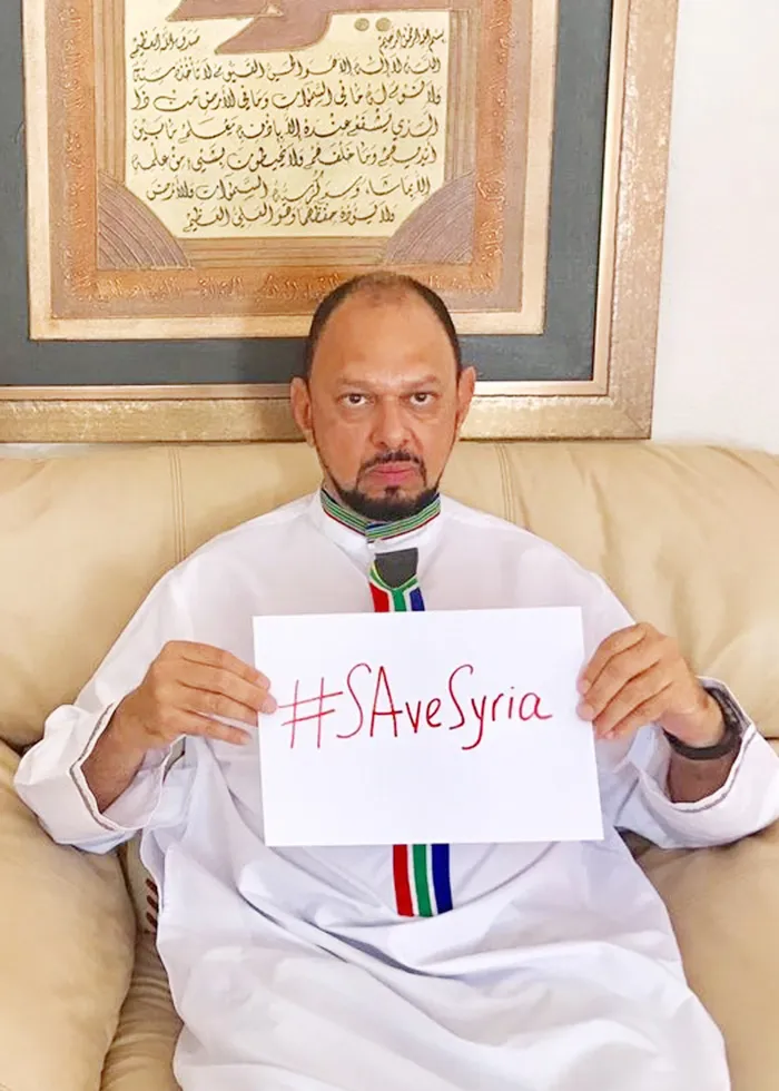 Yusuf Abramjee holds the #SAveSyria banner in support of those who have been displaced in the civil war that has plagued Syria for a number of years. Picture: Supplied Yusuf Abramjee holds the #SAveSyria banner in support of those who have been displaced in the civil war that has plagued Syria for a number of years. Picture: Supplied