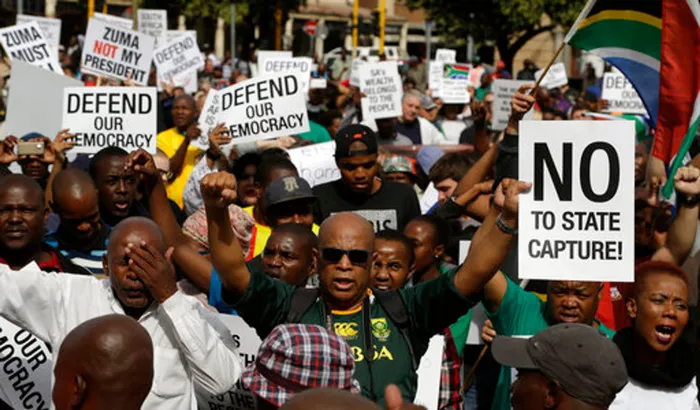 Demonstrators protest against President Jacob Zuma outside the Union Buildings in Pretoria. Picture: Themba Hadebe/AP Demonstrators protest against President Jacob Zuma outside the Union Buildings in Pretoria. Picture: Themba Hadebe/AP