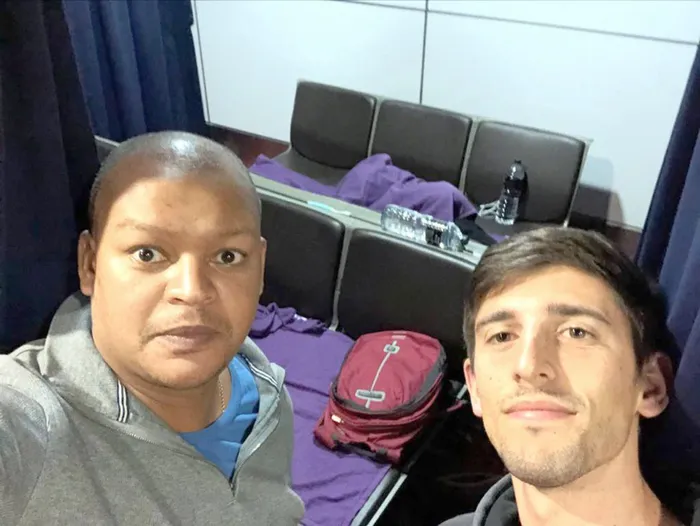 Allan Huysamen from Cape Town and Allister Nunn from Joburg are still waiting to be rescued from the Kuala Lumpur International Airport in Malaysia. Picture: Supplied Allan Huysamen from Cape Town and Allister Nunn from Joburg are still waiting to be rescued from the Kuala Lumpur International Airport in Malaysia. Picture: Supplied