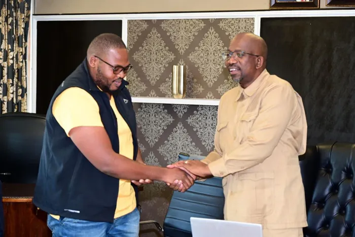 KZN Health Head of Department, Dr Sandile Tshabalala and Dr Thanduxolo Cele shaking hands, following agreement on the employment of the unemployed doctors. Picture: Sandile Makhubela