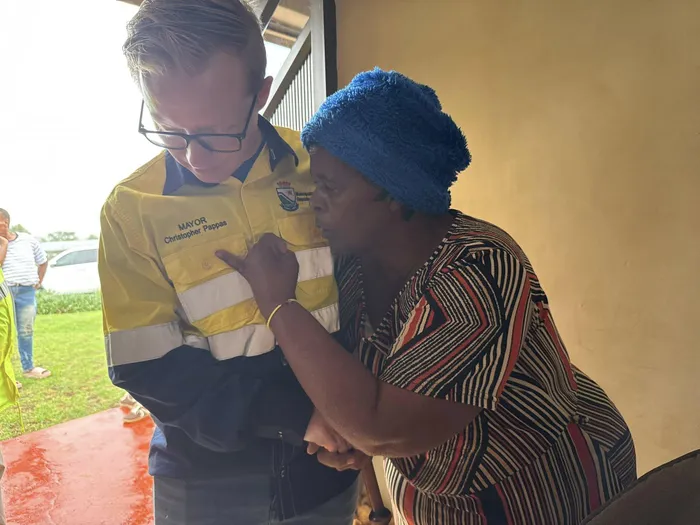 Assessing the damage in Mpophomeni, Mayor Chris Pappas speaks with an affected woman.