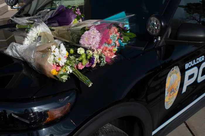 People brought flowers to the Boulder Police Department in honour of officer Eric Talley, who was killed while trying to protect others. Picture: Rachel Woolf for The Washington Post