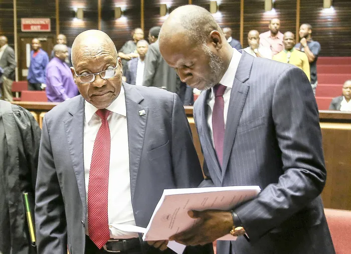 Former president Jacob Zuma and his lawyer Daniel Mantsha look over papers while they wait for proceedings to start in the Pietermaritzburg High Court. Picture: Leon Lestrade/African News Agency (ANA) Former president Jacob Zuma and his lawyer Daniel Mantsha look over papers while they wait for proceedings to start in the Pietermaritzburg High Court. Picture: Leon Lestrade/African News Agency (ANA)