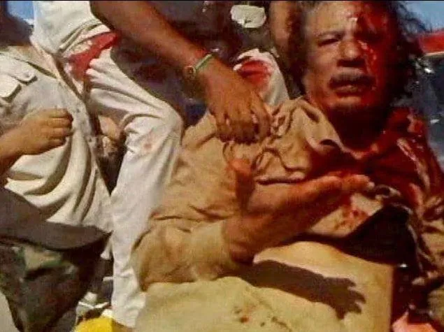 2011 Libyan strongman Muammar Gaddafi is killed in the Battle of Sirte. Found hiding in a culvert, he is sodomised with a knife while pleading for his life. He dies of his injuries.