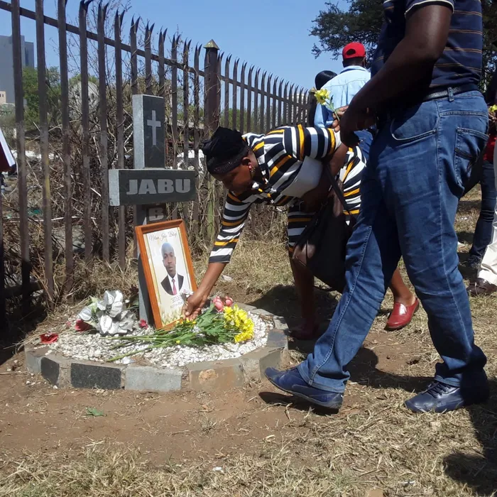 Mourners lay wreaths on a symbolic tombstone for late taxi driver Jabu Baloyi. Picture: Rapula Moatshe