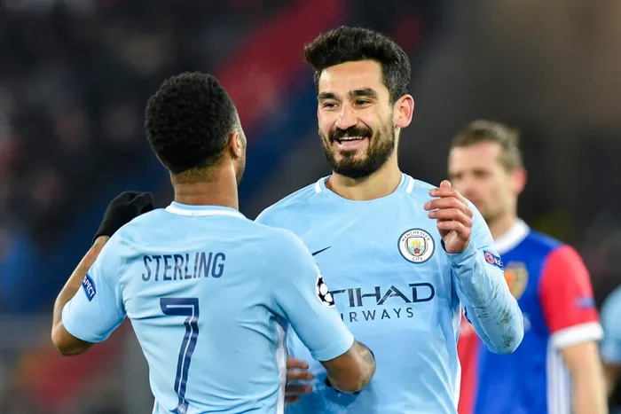 Ilkay Gundogan is congratulated by Raheem Sterling after scoring for Manchester City against Basel on Tuesday night. Photo: Walter Bieri/EPA Ilkay Gundogan is congratulated by Raheem Sterling after scoring for Manchester City against Basel on Tuesday night. Photo: Walter Bieri/EPA