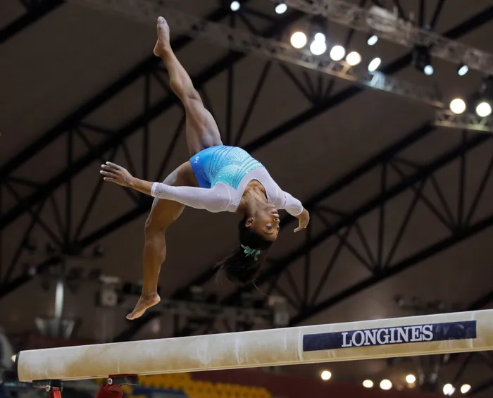 Simone Biles performs on the balance beam during the Women's All-Around Final at the world championships on Thursday. Photo: Vadim Ghirda/AP Simone Biles performs on the balance beam during the Women's All-Around Final at the world championships on Thursday. Photo: Vadim Ghirda/AP
