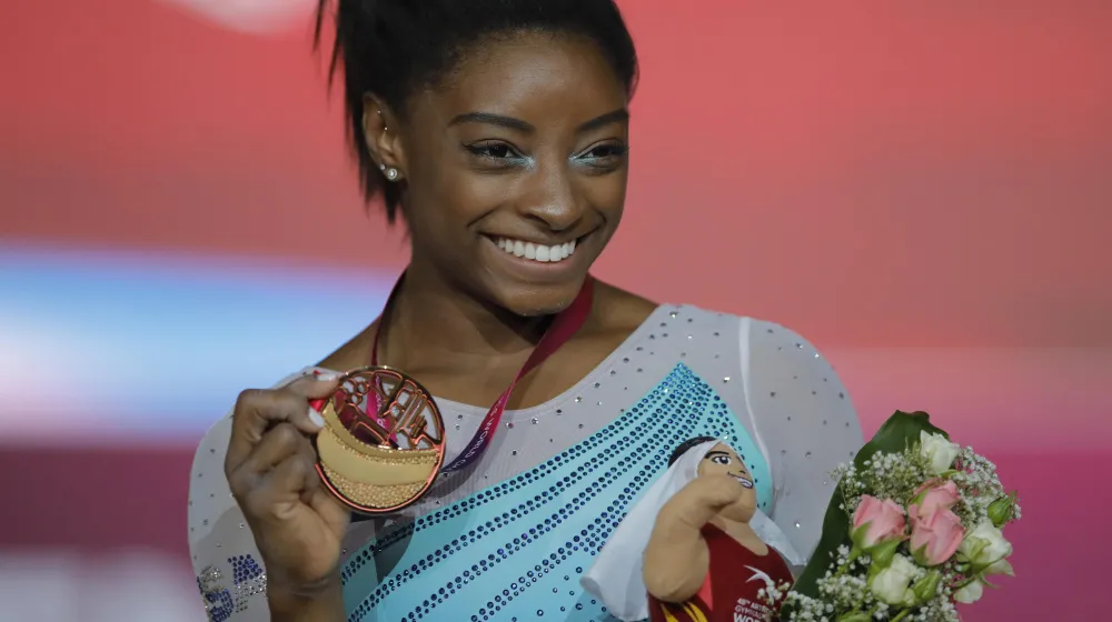 Simone Biles shows off her gold medal at the world championships in Doha. Photo: Vadim Ghirda/AP