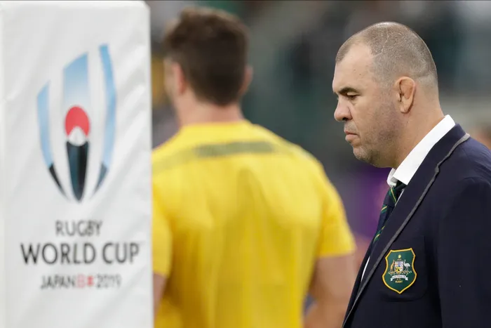 Australia coach Michael Cheika watches as his team warm up before the Rugby World Cup quarterfinal match at Oita Stadium against England. Photo: AP Photo/Aaron Favila Australia coach Michael Cheika watches as his team warm up before the Rugby World Cup quarterfinal match at Oita Stadium against England. Photo: AP Photo/Aaron Favila