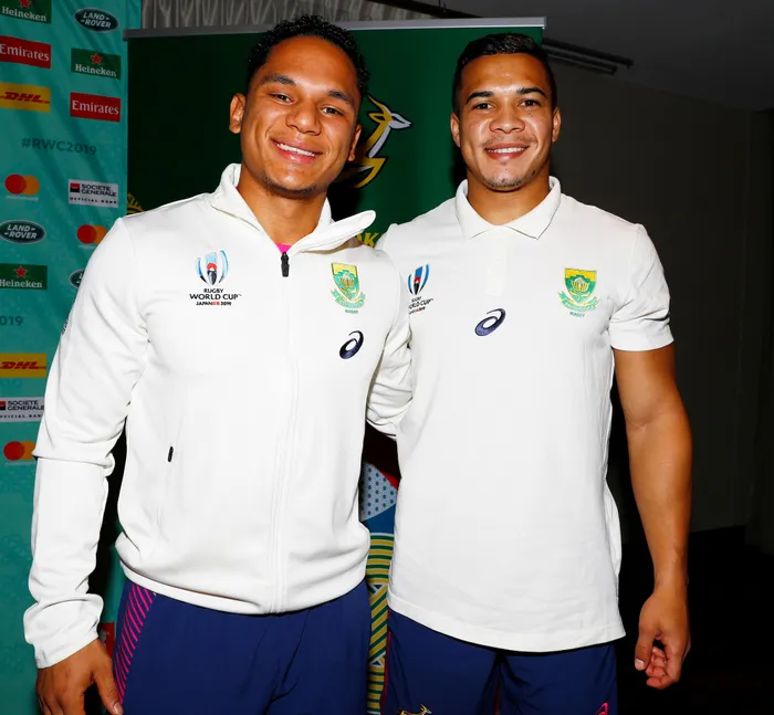 Herschel Jantjies with Cheslin Kolbe during a Springboks press conference at the Keio Plaza Hotel Tokyo Nishi-Shinjuku. Photo: Steve Haag Sports / Hollywoodbets Herschel Jantjies with Cheslin Kolbe during a Springboks press conference at the Keio Plaza Hotel Tokyo Nishi-Shinjuku. Photo: Steve Haag Sports / Hollywoodbets