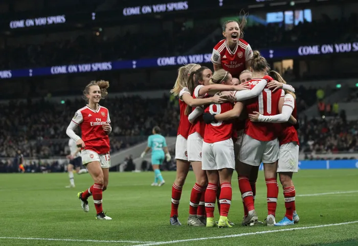 Arsenal players celebrate after Vivanne Miedema scores her sides second goal during their clash against Tottenham Hotspur at the Tottenham Hotspur Stadium in London on Sunday. Photo: Zac Goodwin/AP Arsenal players celebrate after Vivanne Miedema scores her sides second goal during their clash against Tottenham Hotspur at the Tottenham Hotspur Stadium in London on Sunday. Photo: Zac Goodwin/AP