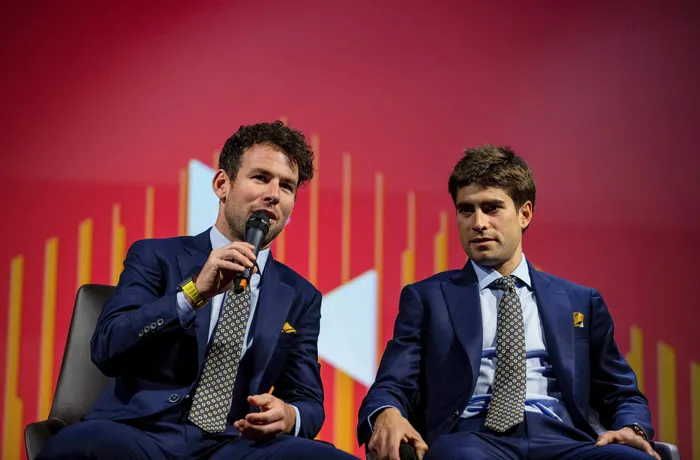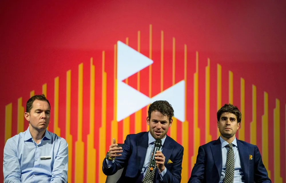 Launching the Bahrain-McLaren cycle team, with Mark Cavendish, left, and Ivan Garcia Cortina, during the press conference at the McLaren Technology Centre in Woking, England, on Monday. Photo: Steven Paston/PA via AP Launching the Bahrain-McLaren cycle team, with Mark Cavendish, left, and Ivan Garcia Cortina, during the press conference at the McLaren Technology Centre in Woking, England, on Monday. Photo: Steven Paston/PA via AP