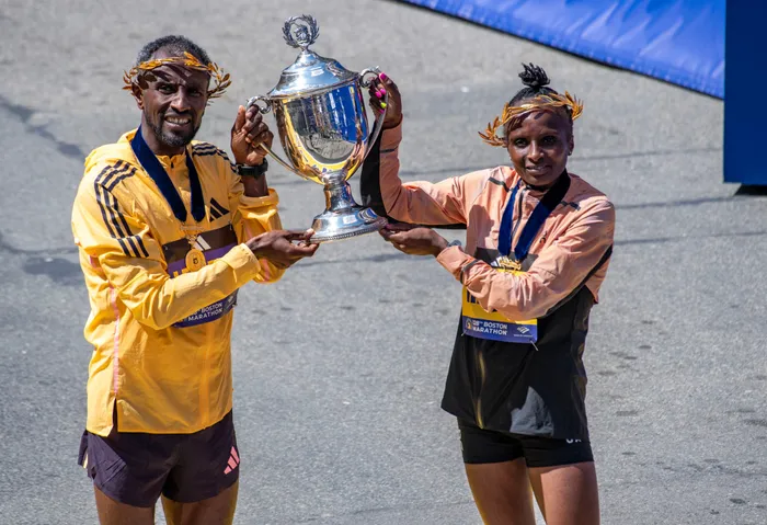Sisay Lemma of Ethiopia and Hellen Obiri of Kenya hold the race trophy together after both taking first place in the men’s and women’s professional fields during the 128th Boston Marathon in Boston on Monday Sisay Lemma of Ethiopia and Hellen Obiri of Kenya hold the race trophy together after both taking first place in the men’s and women’s professional fields during the 128th Boston Marathon in Boston on Monday. Photo: Joseph Prezioso/AFP