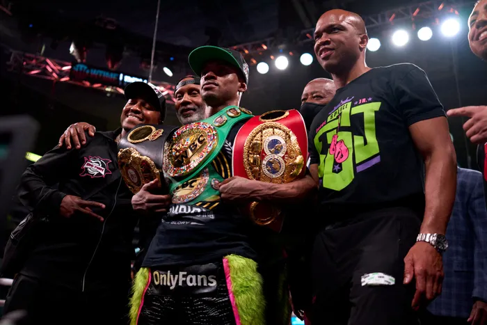 Errol Spence Jr. celebrates after defeating Yordenis Ugas at AT&T Stadium. Photo: Cooper Neill/Getty Images via AFP