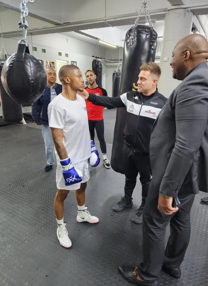 Former IBF junior-flyweight champion Sivenathi Nontshinga alongside his trainer Colin Nathan and Sports Minister Gayton McKenzie.Photo: Gayton McKenzie/X