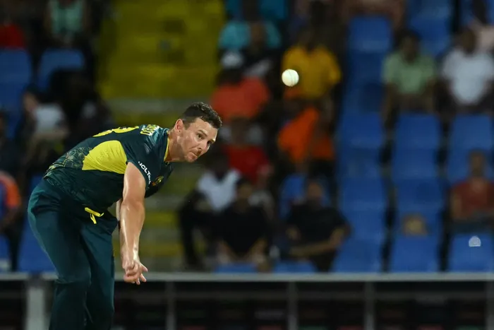 Australia's Josh Hazlewood bowls during their ICC men's Twenty20 World Cup 2024 Super Eight cricket match against Bangladesh Australia's Josh Hazlewood bowls during their ICC men's Twenty20 World Cup 2024 Super Eight cricket match against Bangladesh. Photo: Andrew Caballero-Reynolds/AFP