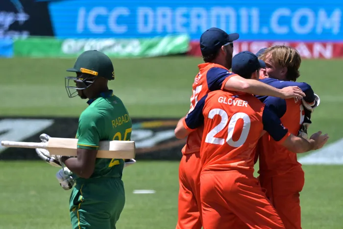Netherlands players celebrate their unlikely win as South Africa's Kagiso Rabada leaves the field during their Twenty20 World Cup match at Adelaide Oval Netherlands players celebrate their unlikely win as South Africa's Kagiso Rabada leaves the field during their Twenty20 World Cup match at Adelaide Oval. Photo: Brenton Edwards/AFP