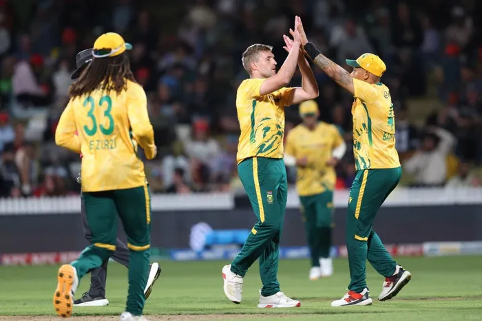 Proteas allrounder Wiaan Mulder celebrates a wicket with teammate Ottneir Baartman.