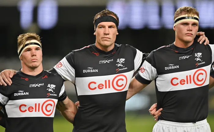 James Venter, Reniel Hugo (captain) and Ockie Barnard of the Cell C Sharks during a tribute to legendary Sharks coach Ian MacIntosh at Kings Park in Durban on April 7 this year. Only a win will be good enough for the Lions if they want to be among the four semi-final teams at the end of the weekend, while the Durban side can secure their spot with a win. Seen here: James Venter (left(, Reniel Hugo (Captain) and Ockie Barnard. Picture: Gerhard Duraan/BackpagePix