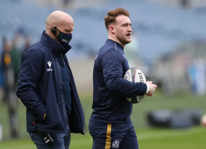 FILE - Scotland head coach Gregor Townsend with flyhalf Stuart Hogg. Photo: Russell Cheyne/Reuters