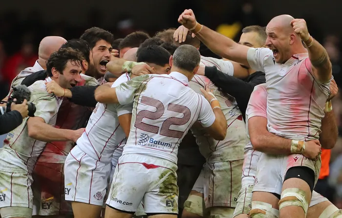 Georgia's players celebrate wining thei Autumn Nations Series International rugby union match against Wales at the Principality Stadium in Cardiff on Saturday Georgia's players celebrate wining thei Autumn Nations Series International rugby union match against Wales at the Principality Stadium in Cardiff earlier today. Photo: Geoff Caddick/AFP