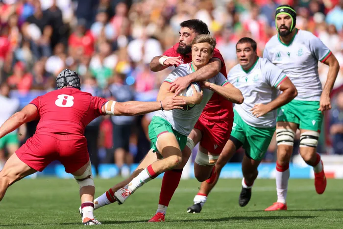 Portugal flyhalf Jeronimo Portela is tackled by Georgia's Lado Chachanidze and Beka Gorgadze during their Rugby World Cup Pool C match Portugal flyhalf Jeronimo Portela is tackled by Georgia's Lado Chachanidze and Beka Gorgadze during their Rugby World Cup Pool C match at Stadium de Toulouse in Toulouse on Saturday. Photo: Charly Triballeau/AFP
